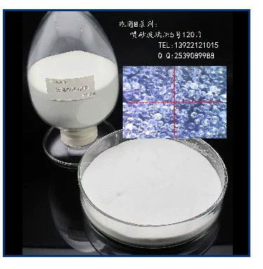 圖中有顯微放大讀數(shù),表面看是白色粉末狀,40倍放大顯現(xiàn)透明玻璃珠形狀。色澤判斷質(zhì)量,越白越優(yōu)質(zhì)。反之,越暗噴砂出來(lái)的產(chǎn)品也越暗。